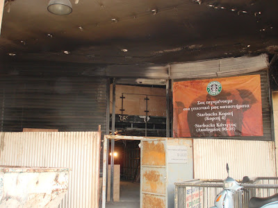 Os estragos dos últimos dias no centro de Atenas são visíveis. A fúria dos manifestantes não poupou lojas, bancos, hoteis... Os vidros partidos em todo o lado dão lugar aqui e ali a lojas completamente carbonizadas e o cheiro a queimado é ainda intenso. Em baixo, a Bershka, H&M, Starbucks e um Banco... entre muitos estragos: